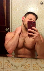 Anon Top is shirtless and flexing his muscles in the mirror. He's holding a phone with one hand, showcasing his fit body. This image is from Houston.