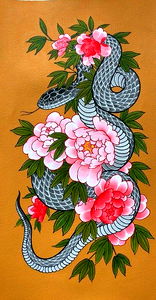 A striking tattoo design featuring a snake intricately adorned with vibrant floral motifs, reminiscent of classic tattoo aesthetics. The gold background adds depth and elegance to the overall design. Raven Leo's model name suggests a connection to nature and a love for art.