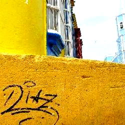 The image captures a lively scene of street art, with a yellow wall as the backdrop. The tag 'Dizzy' is prominently displayed, suggesting the presence of a popular local musician or artist. The overall atmosphere conveys a youthful and creative spirit typical of urban environments.