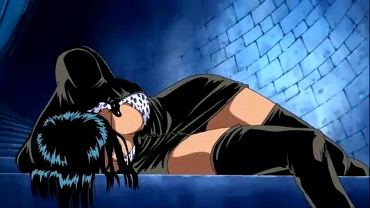 A promotional image for a video game, featuring the OnlyFans model Nino posing as a character, looking relaxed and comfortable. The background is dimly lit, emphasizing her attire and the overall moody atmosphere.