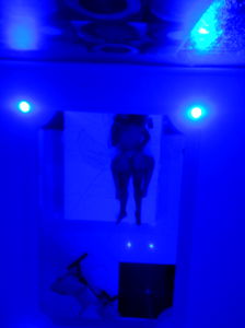 The image shows a display featuring a model photo of OnlyFans model S+A. The model is positioned in front of a blue light, with the focus primarily on her. No text is present within the image, and there are no distinct items that can be confidently identified. The room has a casual ambiance, likely part of an apartment or a studio space.