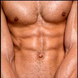 A male model poses in a shirtless body shot that highlights his muscular physique and well-defined abs. The image has a water effect on the chest area, giving it a glistening, wet appearance. This suggests a focus on fitness, health, or sports. The model is likely to be based in New York and is part of OnlyFans platform.