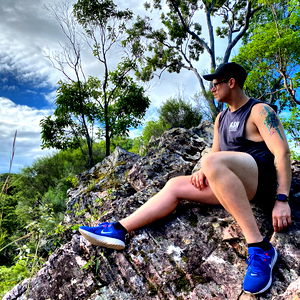 This is a photo of Toby from Qld, Australia. He's enjoying some downtime in his underwear, surrounded by nature. His glasses and thoughtful expression suggest he's taking a moment to appreciate the serenity.