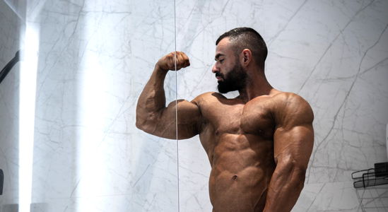 Anthony Beau, an OnlyFans model and fitness enthusiast, showcases his well-defined physique. In the image, he is in a bathroom mirror, flexing his muscles with a look of determination on his face.