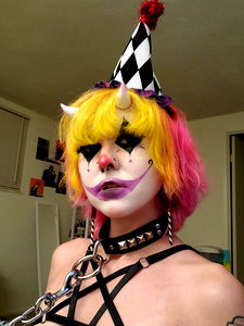 An Onlyfans model named Bee is seen sporting a playful clown makeup style. The image captures the creative fusion of traditional clown aesthetics with modern, edgy elements.
