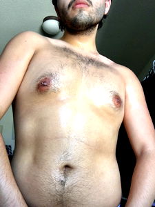 A shirtless young man, possibly in his late teens to early twenties, from San Jose, California, takes a momentary pause in front of the camera. He sports a beard and mustache, adding a rugged touch to his appearance.