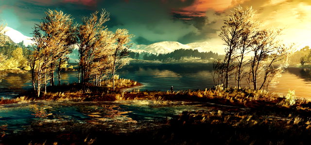 This is a serene digital painting depicting an autumn scene with a lake, forest, and a dramatic sky. The colors are rich and warm, evoking the feeling of fall. It features a tranquil landscape where nature is beautifully rendered in high detail. Artistic in style, this image could be used for various purposes, including as a wallpaper or to promote an autumn-themed event or product. For instance, it might appeal to those who enjoy the outdoors, nature photography or painting, and seasonal art.