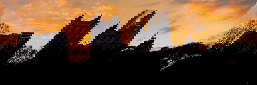 A captivating view of a city skyline during sunset, featuring the Atlanta skyline with towering buildings illuminated against the backdrop of the setting sun.