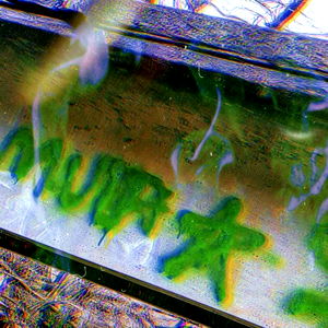 The image shows a piece of wooden furniture, possibly a bench or table, with graffiti written in green. The writing appears to be a combination of letters and symbols that could be interpreted as text or markings, but the content is not immediately clear from this perspective. The wooden surface has an uneven texture, and there are no other objects visible in the image. There is also some blurred detail that suggests the photograph may have been taken in low light conditions.