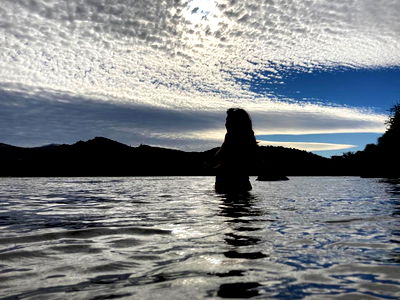 Antito is captured in tranquil solitude by the water. This image showcases her poised stance, looking out across the calm waters under a dramatic sky.