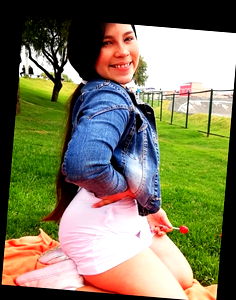 The image shows a young woman posing in a park setting. She is wearing a white crop top and denim shorts. Her expression is cheerful with a smile on her face.
