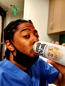 In the image, Antonio S. is seen taking a sip of beer while wearing scrubs, indicating his profession as a medical worker. He appears to be in a comfortable and relaxed setting, possibly in a break room or similar space within a medical facility. His attire and surroundings suggest he is enjoying a moment of leisure in the middle of what could be a long shift.