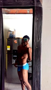 A shirtless man with dark skin, showcasing his athletic build and blue underwear. He is standing confidently in front of a mirror, capturing the moment with a smartphone.