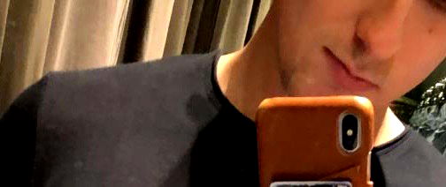 Andy, a young man with tattoos on his arms, is seen shirtless in a bathroom mirror. He appears to be in his mid-twenties and showcases his fit physique through a phone case.