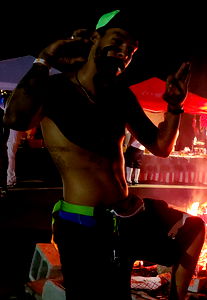 Candid moment of an OnlyFans model, Anubis. He is outdoors in a relaxed stance, signaling with his hands atop what appears to be a BBQ event. The atmosphere suggests a social gathering or festival.