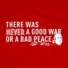 T-shirt with a political slogan that comments on war and peace. It features an illustration of the famous quote 'There was never a good war or a bad peace.' The text is white on a red background, and there's an image of George Washington in the top left corner.