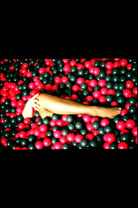 This is an artistic photograph featuring a person submerged in a red berry surface, with their legs and feet playfully poking out of the water. The model is wearing nylon stockings, and the image has a soft-focus quality that adds to its dreamy aesthetic.