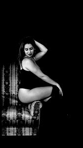 Exuding a classic pinup vibe, Any Lu showcases her allure in an image that transports viewers to a bygone era. Her attire and the chair she sits on further enhance this nostalgic atmosphere.