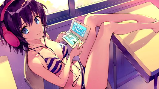 AnzuWaifu, a popular anime model from Chile, is seen in her studio. She is holding a gaming console and has gaming headphones on her ears. A pink bikini adds to her youthful charm.