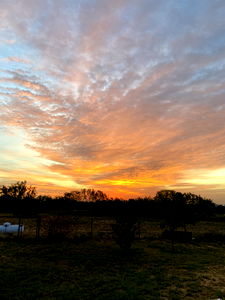 This image captures a beautiful sunset over a tranquil rural field. The warm hues of the sky and the silhouette of trees in the background create a serene and peaceful atmosphere. It's a great representation of life in the countryside.