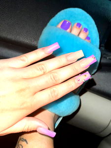 Image capturing a close-up of a female OnlyFans model's nails, painted with vibrant colors and styled in an artistic fashion. Her feet are adorned with blue slippers that match her nail polish. She is also seen sporting purple nails, reflecting her personal style.