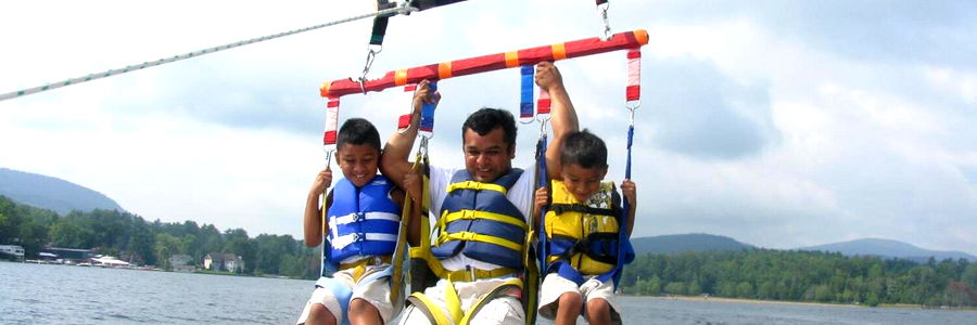 A family enjoying an exciting water adventure on an inflatable raft. The two boys seem to be having fun as they swing from the side of the boat, while the adult keeps a watchful eye.