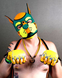 An OnlyFans model posing playfully as a dog in costume, complete with mask and paws.