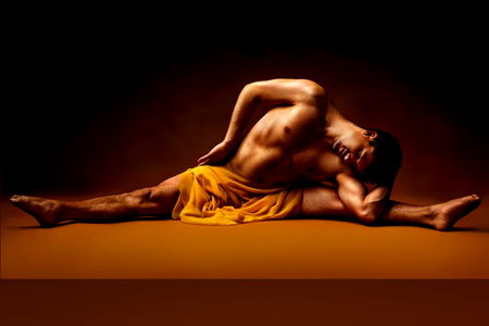 An artistic rendition featuring a muscular, shirtless man with his head in his hands. The scene is set against a dark background, creating a stark contrast with the vibrant yellow fabric flowing around him, possibly symbolizing motion or freedom. The subject's focused expression and dynamic pose evoke a sense of drama and intensity. This piece could be considered a portrait, focusing on the human form and the emotional impact of color and light.