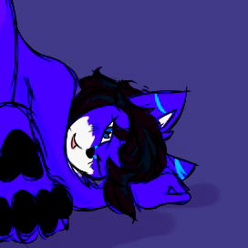 This is an illustration of an anthropomorphic cat, resembling a puppy in some ways. It has blue fur, fluffy ears, and appears to be enjoying a relaxing moment on its back.