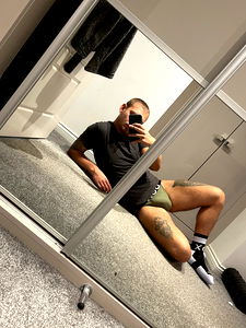 A mirror image of the OnlyFans model Tis Apol. He appears to be in a dressing room, taking a selfie. His reflection shows him looking relaxed and confident. The focus is on his pose and expression, which gives an insight into his character.