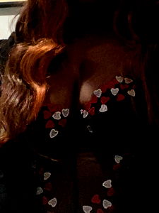 A captivating model in the Untied States captures attention with a seductive lingerie pose. Waterfall's ensemble includes a striking red bra and a black garment adorned with hearts, creating an image of both strength and vulnerability. The model stands confidently, exuding an air of sophistication against a neutral background. This provocative imagery is sure to turn heads.