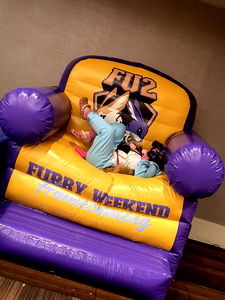 An inflatable chair for a pet-friendly pool party, designed for the comfort of pets, with branding and promotional text. The model is named Pip_the_pup from Nebula.