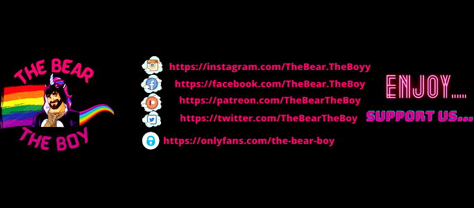 A stylized graphic with a person in the background, characterized by a beard and hair accessories, set against a rainbow backdrop. The text overlay reads 'THE BEAR' at the top and 'THE BOY' at the bottom.