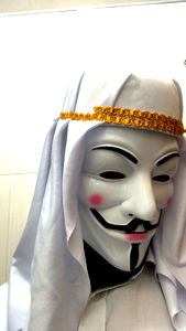 An individual dressed as Guy Fawkes, wearing a white thobe and fez, symbolizing anonymous activism. The image appears to be taken in an indoor setting with a white tile wall.