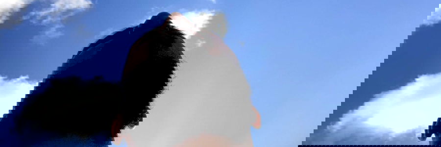 A model photo of a woman in front of a cloudy sky with blue sky in the background. She appears to be looking upwards.
