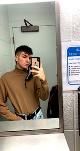 A young man, with long hair, presents confidently for the camera. He's dressed in a beige turtleneck and dark pants, accessorizing his ensemble with a gold chain necklace. His outfit choice reflects a modern, casual style.