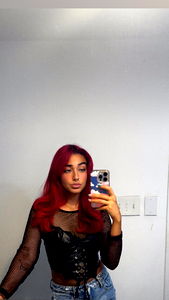 A striking portrait of the social media model Arcadia Jayde, with a vibrant red hair contrasting against the neutral gray background. The model is posing confidently in front of a white wall. Her attire consists of a black tank top and she holds a cell phone casually in her hand.