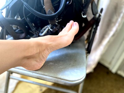 A photograph features an OnlyFans model placing their feet near a motorcycle helmet, which is likely to be a racing or safety helmet. The model is sitting on a step ladder and appears to be in a casual setting. Arch_angel seems to be the name of the model, and the focus of the image is on the interaction between the human element and the equipment typically used in motorsports.
