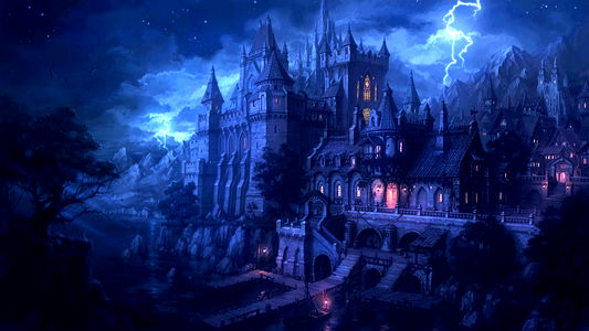 Immerse yourself in the haunting beauty of a castle under the cloak of night. The eerie atmosphere is amplified by the stormy sky and the dark silhouette of the castle's towers against the full moon. A sense of adventure awaits.