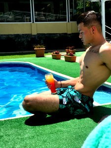 A strong and captivating model image featuring Archie Andrew, a young and handsome man from Ecuador. He's enjoying his time by the pool, holding a drink and lounging on a green patio.