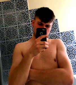 A young male model, Archie Joyce, showcasing his fitness and confidence by striking a pose with a phone in the mirror. His shirtless physique is evident, suggesting a commitment to health and wellness. Based in the UK, he shares his journey on OnlyFans, where he engages with fans from around the world.