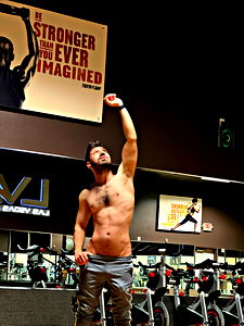 Ardalan, a well-known Onlyfans model, proudly displays his physique after a workout at the gym. His muscular body and toned abs are evident in this post-workout selfie. He's celebrating with a fist pump, standing next to motivational wall art.