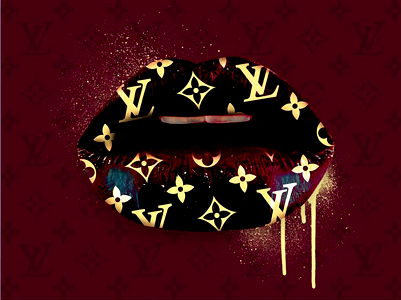 An artistic rendition of a lip art portrait that combines the iconic Louis Vuitton brand with the allure of fashion magazine covers. This image captures the essence of luxury and style, showcasing a striking red lip adorned with gold Vuitton logos, paired with a dripping golden lip accessory.