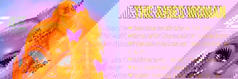 An illustration of the zodiac sign, Aries, as a woman with fiery red hair. The poster is vibrant and colorful, with a playful font that says 'THE ARIES WOMAN'. The background is a gradient from purple to pink, adding to the overall cheerful theme. The model's name, ChocolateRee, is subtly included in the image as well.