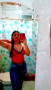 An OnlyFans model showcases her style with a red crop top, black bra, and blue jeans in the bathroom. A selfie captures the moment as she looks directly at the camera. The model also shares tips on creating an outfit that highlights her unique style.