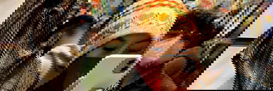 In the center of the image, Ariana is holding up her phone to capture a mirror selfie. Her outfit consists of a playful costume and a colorful beanie. Behind her, another person can be seen in the blurred background, adding depth to the scene.