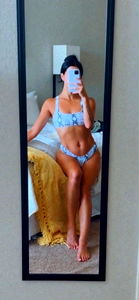 This image showcases a model, ArianaStaar, in a photoshoot setting. She is wearing a blue bikini and posing against a mirror that captures her reflection. The room has a white wall and a bed with a beige comforter can be seen in the background.