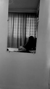 This is a photo of OnlyFans model Arianna Nammour from Colombia. She is in an intimate setting, with one foot playfully on the bed while holding her finger up to her lips, embodying a sultry and alluring persona. Her attire suggests a flirtatious mood and she is seen wearing lingerie. The room around her gives off a tropical vibe with a warm, inviting atmosphere.