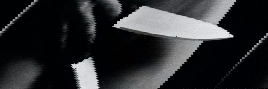 Black and white image capturing a candid moment of Aries in their personal life, away from the public face. The photo shows Aries holding a knife with both hands, seemingly displaying strength and a hint of danger.