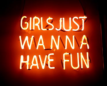 This image features a bold neon sign that captures attention with its vibrant colors and cheeky message. The sign reads, 'Girls Just Want to Have Fun,' conveying a sense of fun and freedom. It's an ideal piece for a bar, restaurant or a decorative item in a home. The sign's design is simple yet impactful.